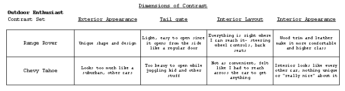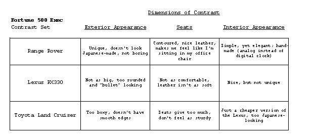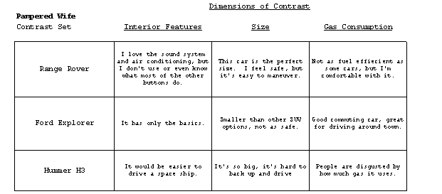 | What's in your Range Rover?: | gardening tools, groceries, service projects | business papers, briefcase, laptop | kid's stuff, shoes, clothes, sporting equipment |