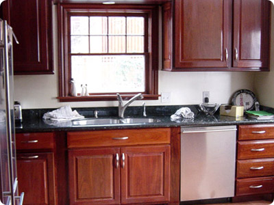 The kitchen is outfitted with very rare, expensive Australian Jara wood. It's similar to popular teak wood, but has a unique red stain.