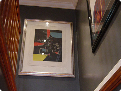 More Jara wood on the staircase leading up to an original Miro. His collection of artwork has been borrowed by modern art museums, including the MOA.