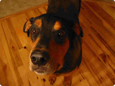 The dog's name is Chompers and he goes everywhere with the family. He's looks tough but isn't. He's 4 feet tall and weights 150 lbs, but he's scared of little dogs and cats.