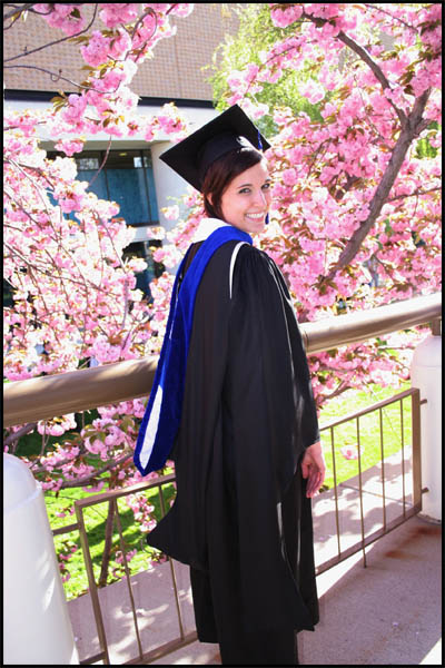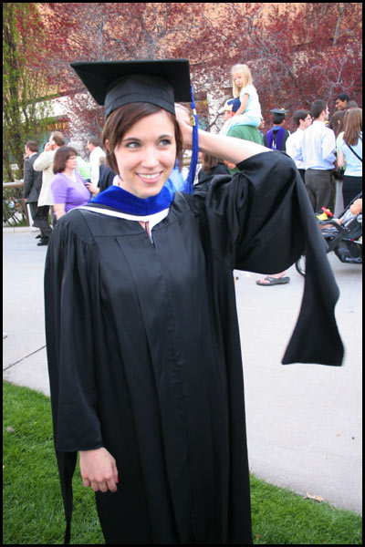 May 2006: As Hugh Nibley would say, "Clothed in the robes of the false priesthood" Reachel accepted her Master of Business degree from Brigham Young University. Her graduate robe was much smarter than the undergraduates because it had long, closed sleeves and a hood. And what a smart graduate, she used that hood as a purse for keys, phone, and lip gloss, now we know why she was in the top 10% of the class of 2006.